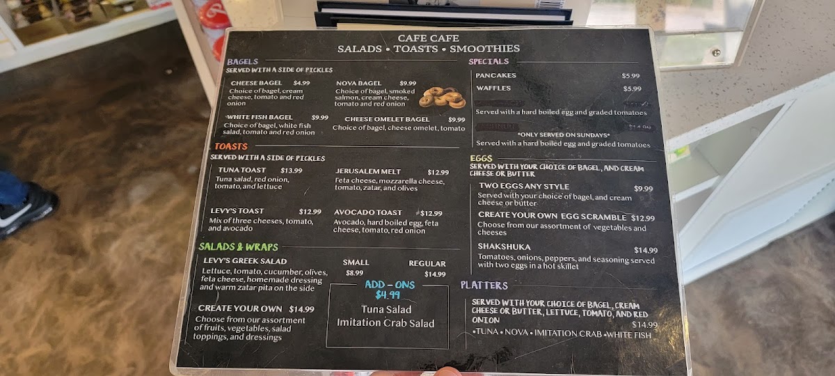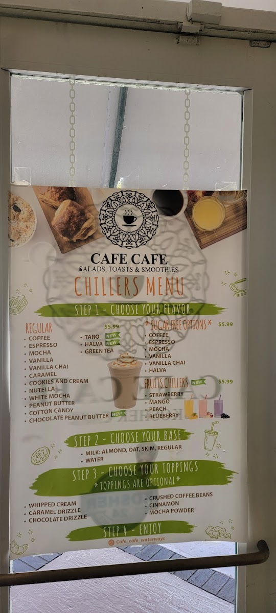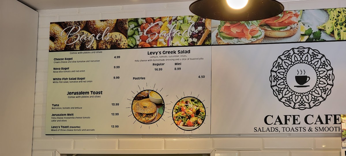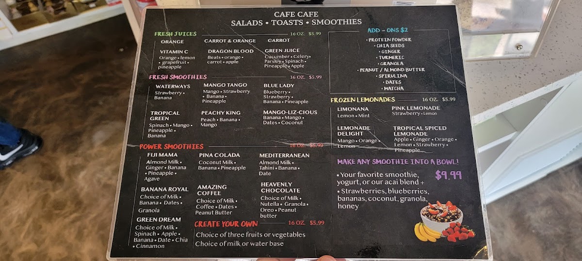 Cafe Cafe At The Waterways offers a diverse and vibrant menu perfect for any time of the day. Their Jerusalem Toast options, including Tuna and Jerusalem Melt, along with Levy's Toast, provide a savory start to your meal. For a refreshing drink, the restaurant serves a selection of Fresh Juices like Vitamin C, Orange, and Carrot & Orange, as well as the bold Dragon Blood. If you’re in the mood for something more indulgent, their Fresh Smoothies like Waterways, Tropical Green, Mango Tango, and Peachy King are a must-try. The Power Smoothies such as Fiji Mama, Banana Royal, Green Dream, and Pina Colada bring a healthy yet energizing twist. For those who love citrus, the Frozen Lemonades are a great choice, with flavors like Limonana, Lemonade Delight, Pink Lemonade, and Tropical Spiced Lemonade. Additionally, for coffee lovers, the menu includes comforting classics like American, Espresso, Double Espresso, Latte, and Cappuccino.